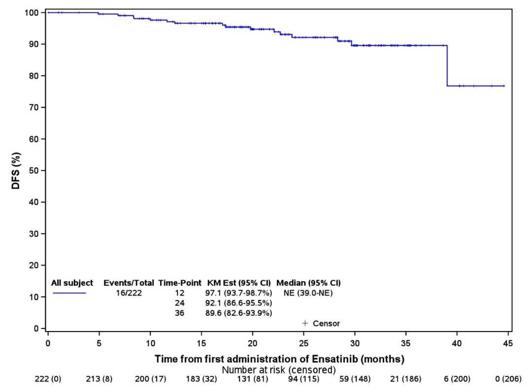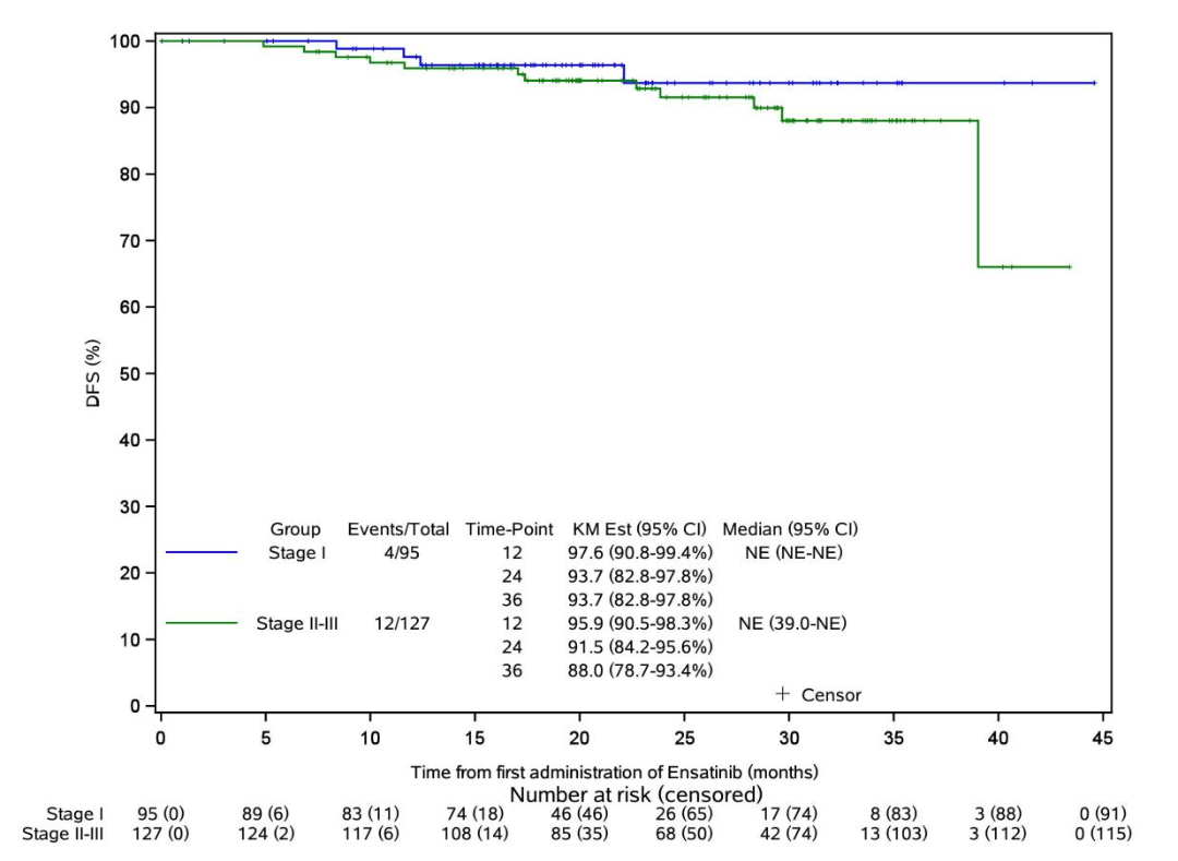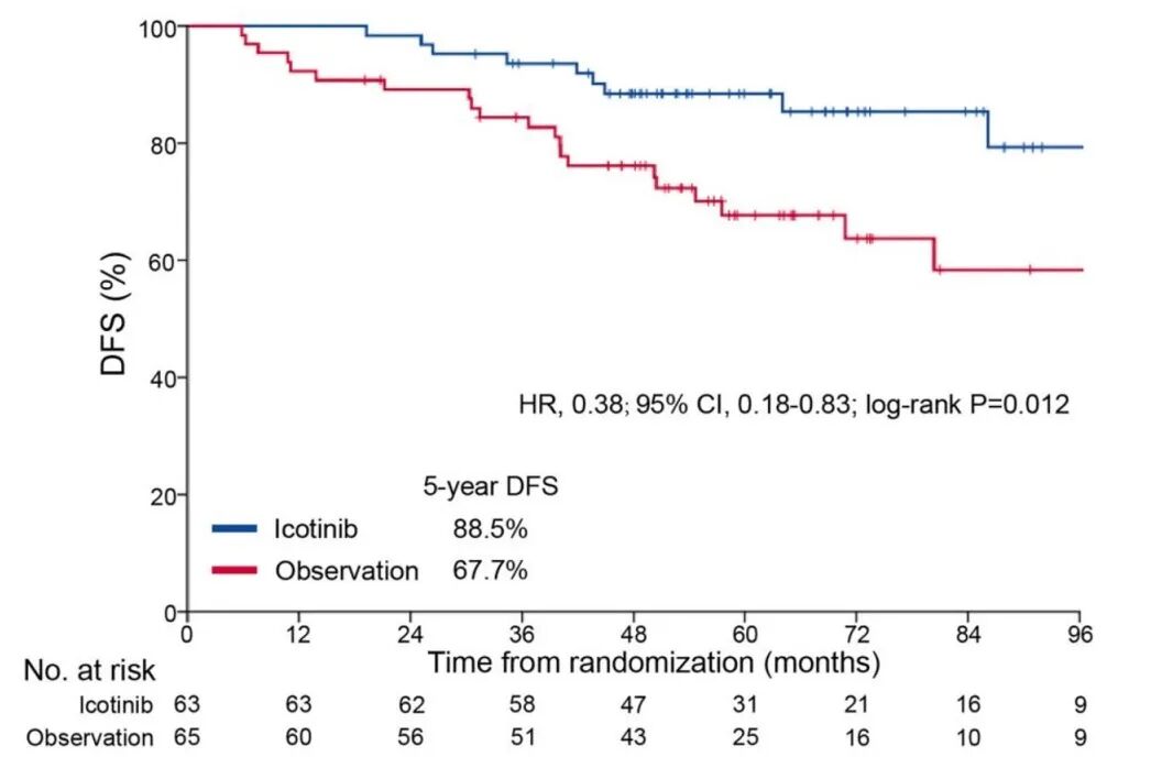 研究名称:恩沙替尼术后辅助治疗ALK阳性非小细胞肺癌患者:一项登记、回顾性、真实世界研究 主要研究者:中国医学科学院肿瘤医院 石远凯教授;中山大学肿瘤防治中心 张兰军教授 研究背景:间变性淋巴瘤激酶(ALK)基因重排发生在大约4-5%的非小细胞肺癌(NSCLC)患者中,这是一种常见的致癌驱动基因改变,与更具侵袭性、更短的复发时间和不良预后相关1-3。目前,阿来替尼是唯一被推荐用于可切除IB-IIIA期(AJCC第7版肿瘤分期)ALK阳性NSCLC患者辅助治疗的ALK酪氨酸激酶抑制剂(TKI)4。鉴于ALK阳性非小细胞肺癌的辅助靶向治疗选择有限,迫切需要进一步探索针对这些患者的新型治疗方案。恩沙替尼是新型第二代ALK TKI,已被国家药品监督管理局批准用于ALK融合阳性局部晚期或转移性非小细胞肺癌的一线和二线治疗。然而,其在术后辅助中的作用仍然未知。这项真实世界研究旨在评价恩沙替尼辅助治疗ALK阳性I-III期非小细胞肺癌的疗效和安全性。 研究设计:回顾性收集在中国接受至少一次恩沙替尼术后治疗完全切除的ALK阳性IA-IIIB期非小细胞肺癌患者(根据AJCC/UICC第八版肿瘤分期)。主要终点是2年无病生存率(DFS)。次要终点包括DFS、总生存期(OS)和安全性。 研究结果:2020年11月19日至2024年5月31日,共筛选296例患者,其中222例患者符合入排标准。患者中位年龄:55岁(范围:20-81),大多数患者为女性(128/222,57.7%)和肺腺癌(218/222,98.2%)。95例患者(42.8%)为I期,43例(19.4%)为II期,84例(37.8%)为III期。32例患者(14.4%)接受了术后辅助化疗。截至2025年1月25日,中位随访时间为23.5个月(95%置信区间[CI],21.7-26.2)。 恩沙替尼治疗的中位持续时间为25.3(范围:3.1-47.2)个月。16例患者出现疾病复发或死亡,其中局部复发7例,远处转移9例。未达到中位DFS(95%CI,39.0,NE),所有患者的2年DFS率为92.1%(95%CI,86.6%-95.5%)。I期患者的2年DFS率为93.7%(95%CI,82.8%-97.8%),II-III期患者的2年DFS率为91.5%(95%CI,84.2%-95.6%)。OS数据未成熟,2例死亡。 安全性方面,207例患者(93.2%)发生任何级别的治疗相关不良事件(TRAEs),11例患者(5.0%)发生≥3级TRAEs。最常见的TRAEs为皮疹(71.2%),≥3级最常见的TRAEs也为皮疹(5.0%;表3)。8例患者(3.6%)报告严重TRAEs。分别有47例(21.2%)、20例(9.0%)和7例(3.2%)患者因TRAE导致减量、治疗暂停和治疗终止。未报告因TRAE导致的死亡。 结论:这是迄今为止最大样本量的ALK TKI 术后辅助治疗的真实世界研究。恩沙替尼在IA-IIIB期(AJCC第八版)ALK阳性非小细胞肺癌中表现出令人鼓舞的疗效和良好的安全性,为该患者群体提供了潜在的辅助治疗选择。 参考文献: 1. Soda, M, et al. Nature 2007; 448 (7153): 561-566. 2. Shi, Y, et al. Thorac Cancer 2015; 6 (1): 10-16. 3. Wong, D, et al. Cancer 2009; 115 (8): 1723-1733. 4. Wu, Y. L, et al. NEJM 2024; 390 (14): 1265-1276. 研究名称:IB期表皮生长因子受体(EGFR)突变型非小细胞肺癌(NSCLC)完全切除术后辅助埃克替尼(12个月)对 比观察的随机、前瞻、开放性II期临床研究 研究牵头人:中国汕尾市深汕医疗中心及孙逸仙纪念医院 王思愚教授 研究设计:CORIN(GASTO1003)研究是一项针对完全切除的EGFR突变ⅠB期NSCLC患者的前瞻性、开放标签、随机对照Ⅱ期临床试验。该研究纳入了未接受过新辅助化疗、辅助化疗或围手术期放疗的患者,随机分为接受1年埃克替尼辅助治疗(125mg,每日三次)和单纯观察两组。研究的主要终点是无病生存期(DFS),次要终点包括总生存期(OS)和安全性。 研究结果: ①DFS显著提升:在中位随访时间为65.0个月时,埃克替尼组的5年DFS率高达88.5%,而观察组为67.7%(log-rank P=0.012,HR=0.38;95%CI:0.18-0.83),埃克替尼组的疾病复发、死亡风险显著降低62%。此前,CORIN研究已经公布了埃克替尼组的3年DFS率,同样显著高于观察组(96.1% VS 84.0%),复发或死亡风险降低77%(HR=0.23,95%CI:0.07-0.81,P=0.013)。由此可见,这一数据不仅远超既往研究,更首次证实了一代EGFR-TKI在ⅠB期患者中的长期获益。 △DFS获益对比 ②OS显著获益:埃克替尼组5年OS率为98.3%,观察组为90.5%(log-rank P=0.045,HR=0.15;95%CI:0.02-1.27),显示出总生存期获益。埃克替尼的耐受性良好,安全性可控。 △OS获益对比 ③颅内复发风险降低:埃克替尼组的脑转移无复发生存期(BMFS)显著优于观察组(P=0.039),这一结果与其在BRAIN研究中展现的脑转移控制能力形成呼应,进一步验证了其对微小转移灶的抑制作用。 结论:CORIN研究本次5年随访数据更新再次证明了IB期EGFR突变阳性NSCLC患者R0切除后接受 埃克替尼辅助治疗,相对于观察,可显著提高患者的DFS率(5年DFS率分别为88.5%和 67.7%),同时安全性和耐受性可接受。