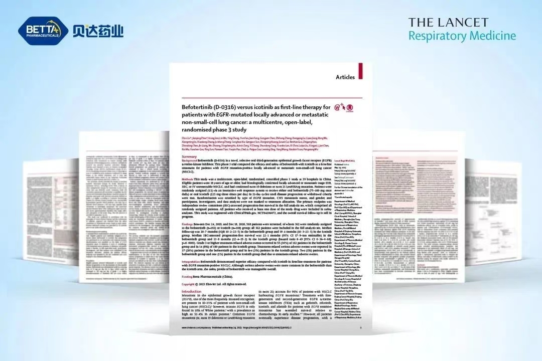 2023年5月25日,贝福替尼III期注册临床研究(IBIO-103研究)在国际权威期刊《柳叶刀· 呼吸医学》(The Lancet Respiratory Medicine)杂志全文发表。该研究是一项比较贝福替尼与埃克替尼用于既往未经治疗的EGFR敏感突变局部晚期或转移性NSCLC患者的多中心、开放标签、随机对照III期研究。贝福替尼组的中位随访时间为20.7个月(IQR: 10.2-23.5),埃克替尼组为19.4个月(IQR: 10.3-23.5)。贝福替尼组的由独立审查委员会评估的中位无进展生存期为22.1个月(95%CI 17.9-不可估计[NE]),埃克替尼组为13.8个月(95%CI12.4-15.2)(风险比0.49 [95%CI 0.36-0.68], p<0.0001)①。研究结果表明贝福替尼在安全性上与既往报道的相关结果一致。《柳叶刀•呼吸医学》在编者按中评价:贝福替尼作为EGFR突变的晚期非小细胞肺癌的治疗,可作为中国患者新的用药选择。
